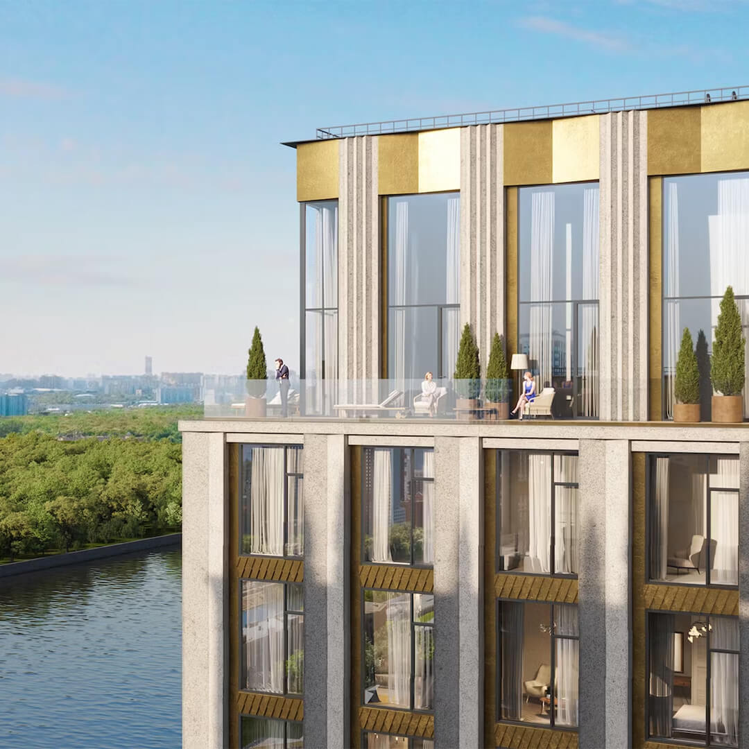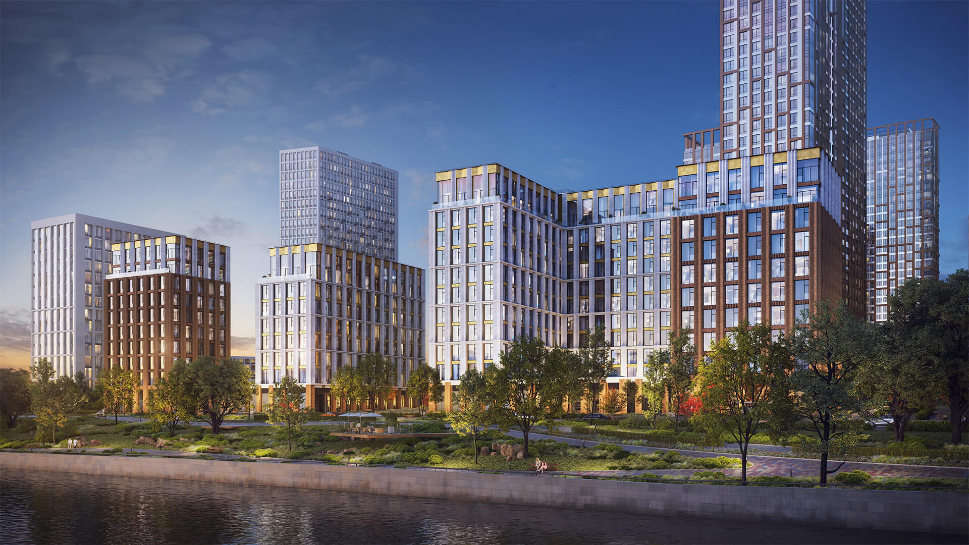 Каждый дом имеет индивидуальный стиль, при этом общий архитектурный ансамбль сохраняет целостность и уникальность. Большие панорамные окна высотой до 3,3 метра открывают впечатляющие виды на Москву-реку и городской ландшафт. Эффектное освещение фасадов подчеркивает выразительность зданий в вечернее время, создавая атмосферу уюта и элегантности.
