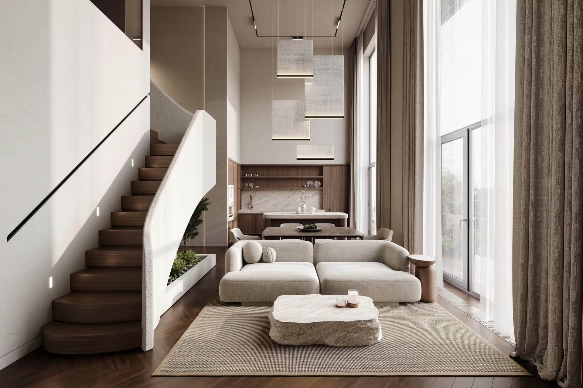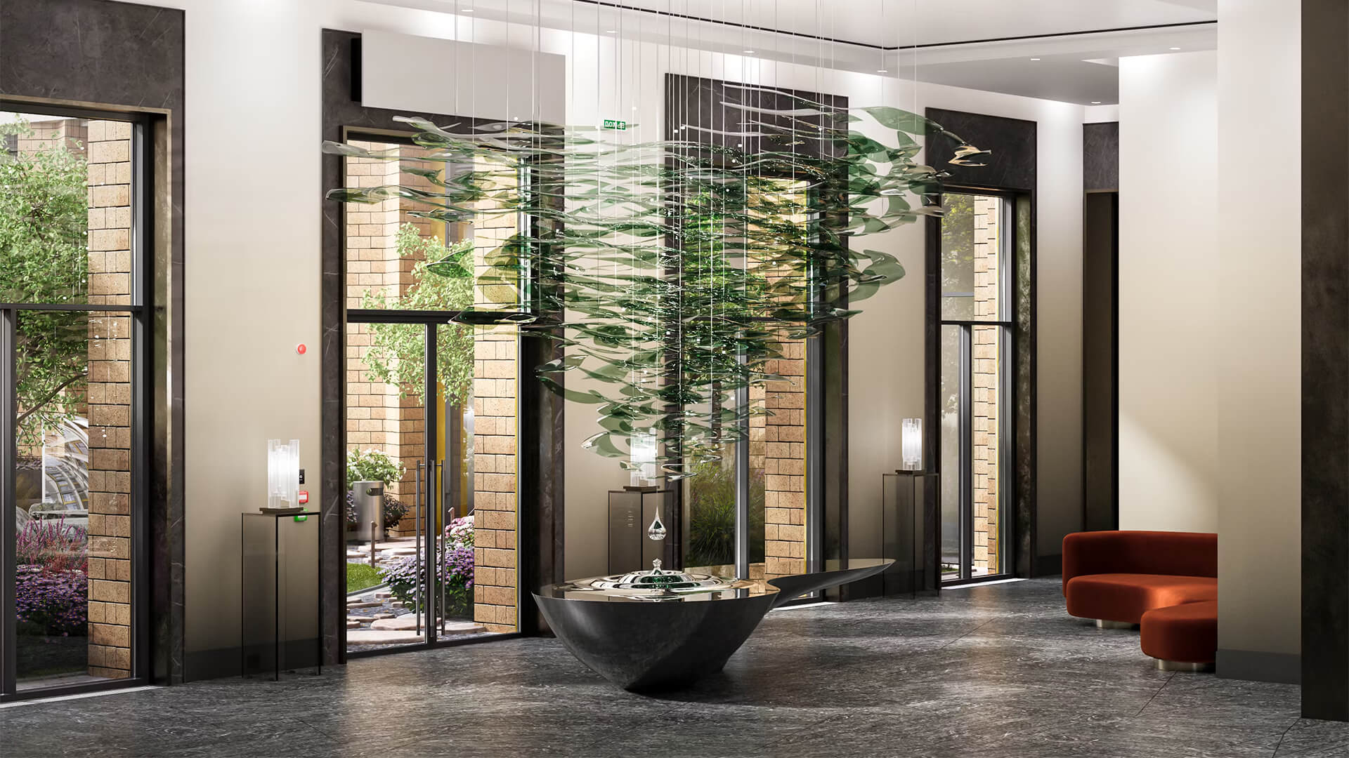 Лобби «Сидней Прайм» — это место, где элегантность встречается с функциональностью. Авторский дизайн, разработанный студией Олега Клодта, включает в себя использование премиальных материалов: мрамор, дерево, латунь, мягкие фактуры и сложные световые сценарии. Все элементы интерьера создают атмосферу изысканности и уюта.